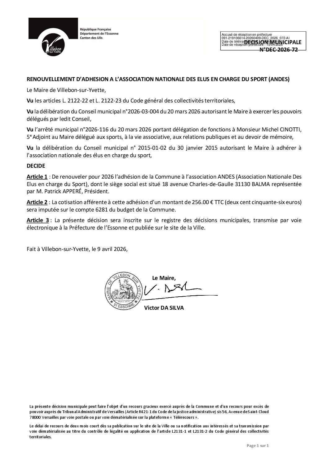 DEC-2026-072 Renouvellement d'adhésion à l'Association nationale des élus en charge du sport (ANDES)