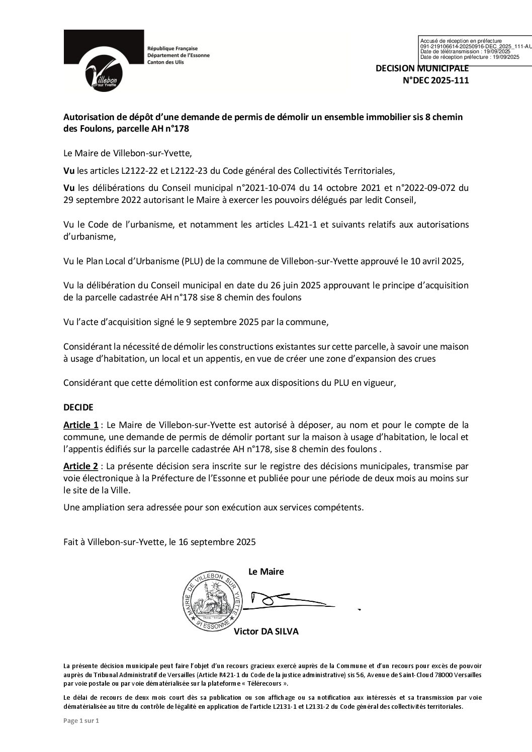 Décisions d'urbanisme:DEC-2025-111 Autorisation de dépôt d’une demande de permis de démolir un ensemble immobilier sis 8 chemin des Foulons – Parcelle AH n°178