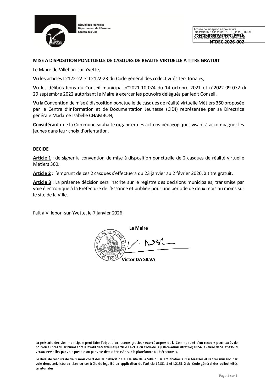 DEC_2026_002 Mise à disposition ponctuelle de casques de réalité virtuelle à titre gratuit