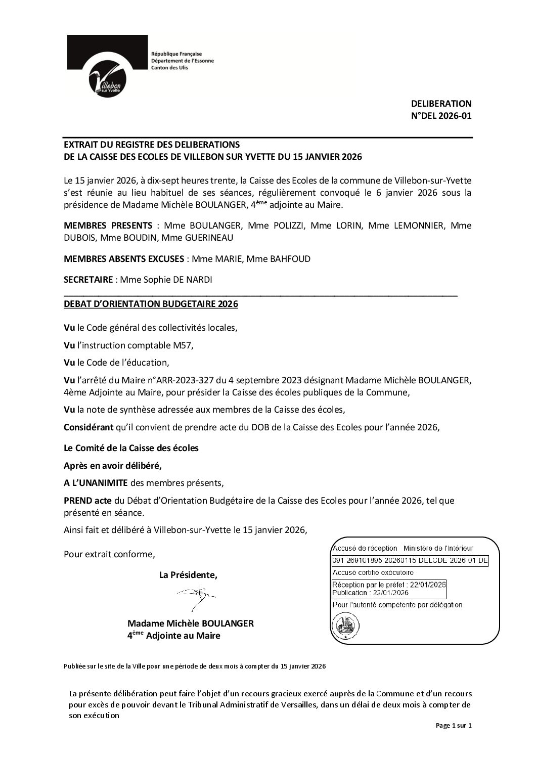 DEL-2026-01 Extrait du registre des délibérations de la caisse des écoles de Villebon-sur-Yvette du 15 janvier 2026